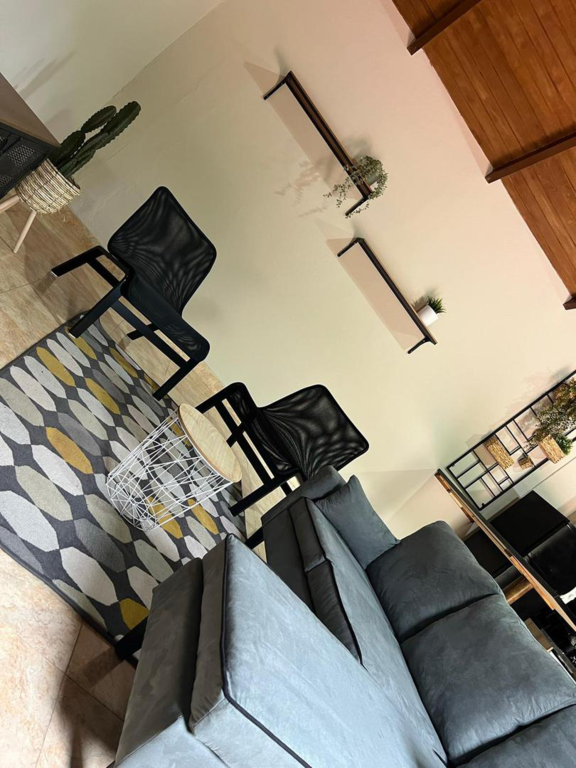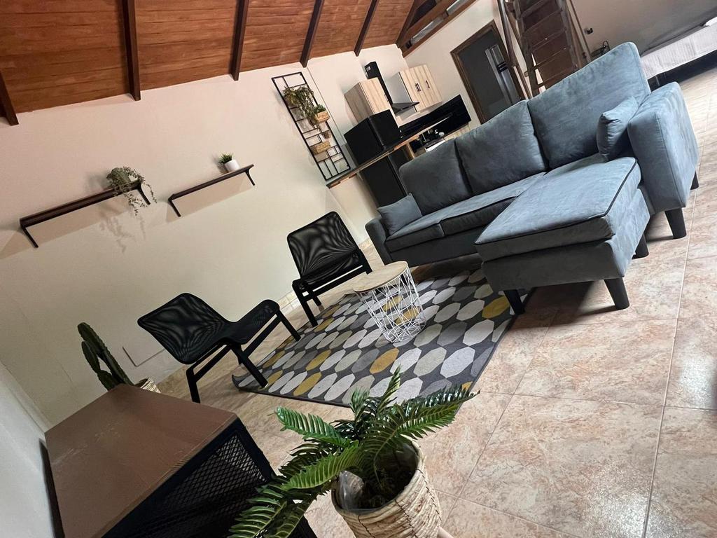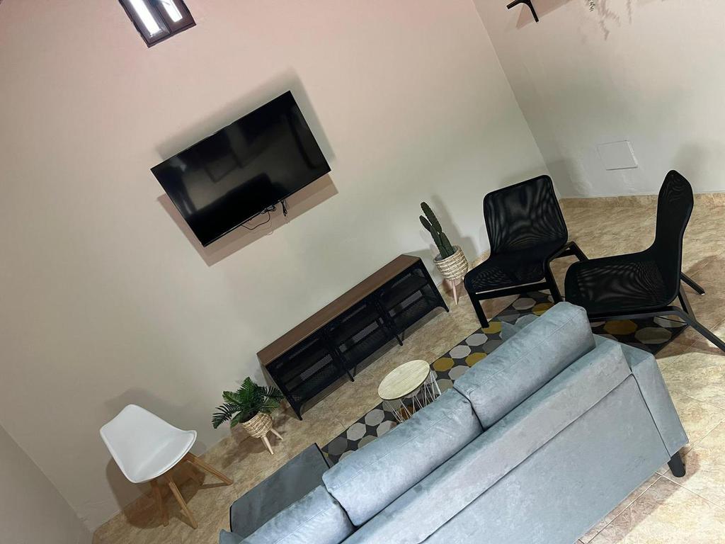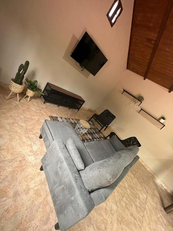 de abajo cuenta con una salita-comedor con un sofá biplaza y dos sillones, una mesa auxiliar, una mesa para 4 y una televisión, una pequeña nevera, un dormitorio con cama de matrimonio más su armario