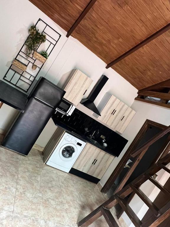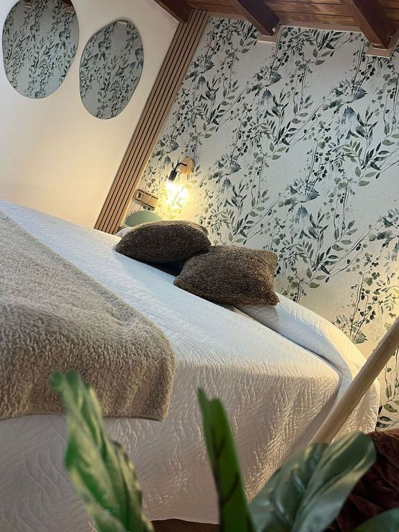 Se encuentra distribuida en dos alturas en la parte de arriba es una buhardilla con 4 colchones individuales sobre una tarima. Y la parte de abajo cuenta con un amplio salón-comedor con un sofá biplaza y dos sillones, una mesa auxiliar, una mesa para seis y una televisión, una cocina completamente equipada (nevera, vitro, lavadora,microondas y fregadero), un dormitorio con cama de matrimonio más su armario (todo esto diáfano) y por último, posee también un cuarto de baño con su ducha de hidromasajes.(El alojamiento no incluye menaje de sartenes ni ollas)