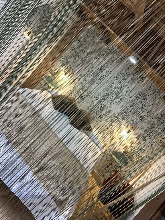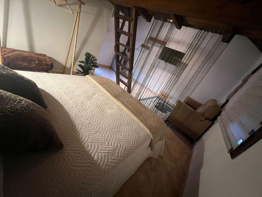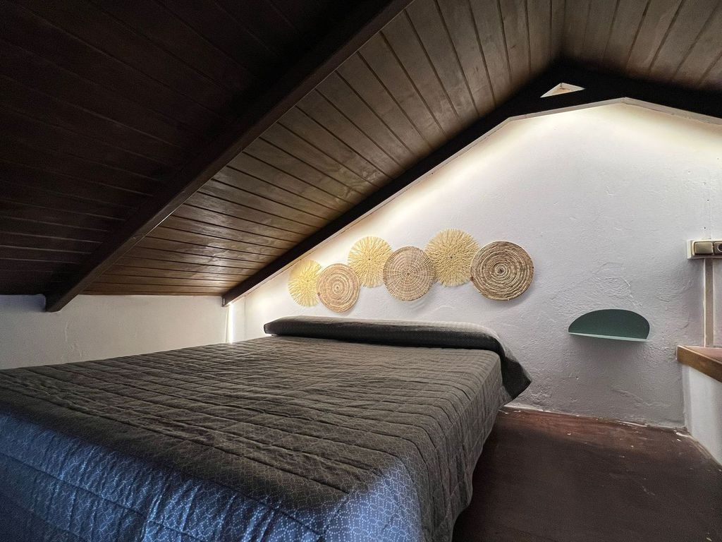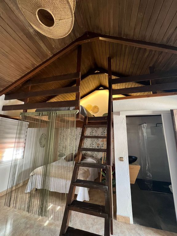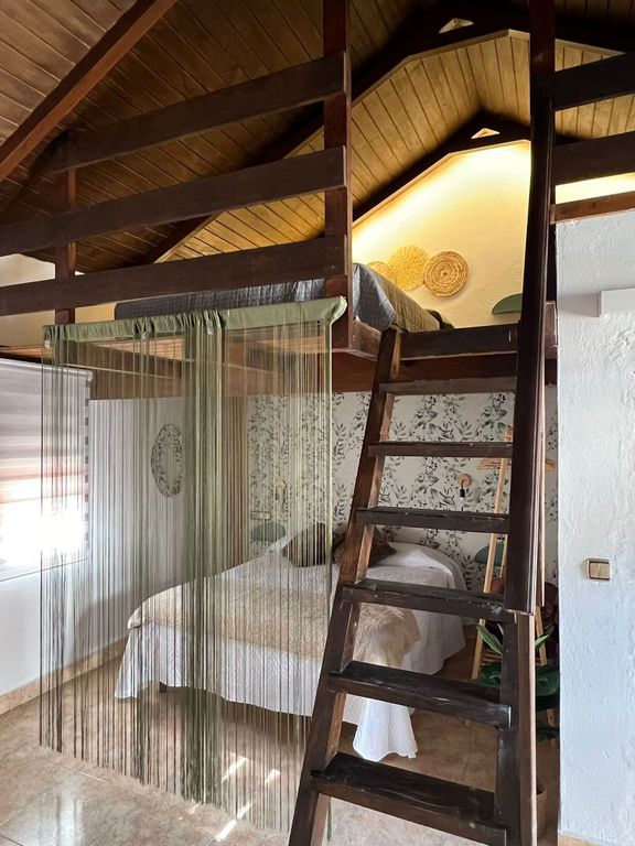 Se encuentra distribuida en dos alturas en la parte de arriba es una buhardilla con 2 colchones individuales sobre una tarima. Y la parte